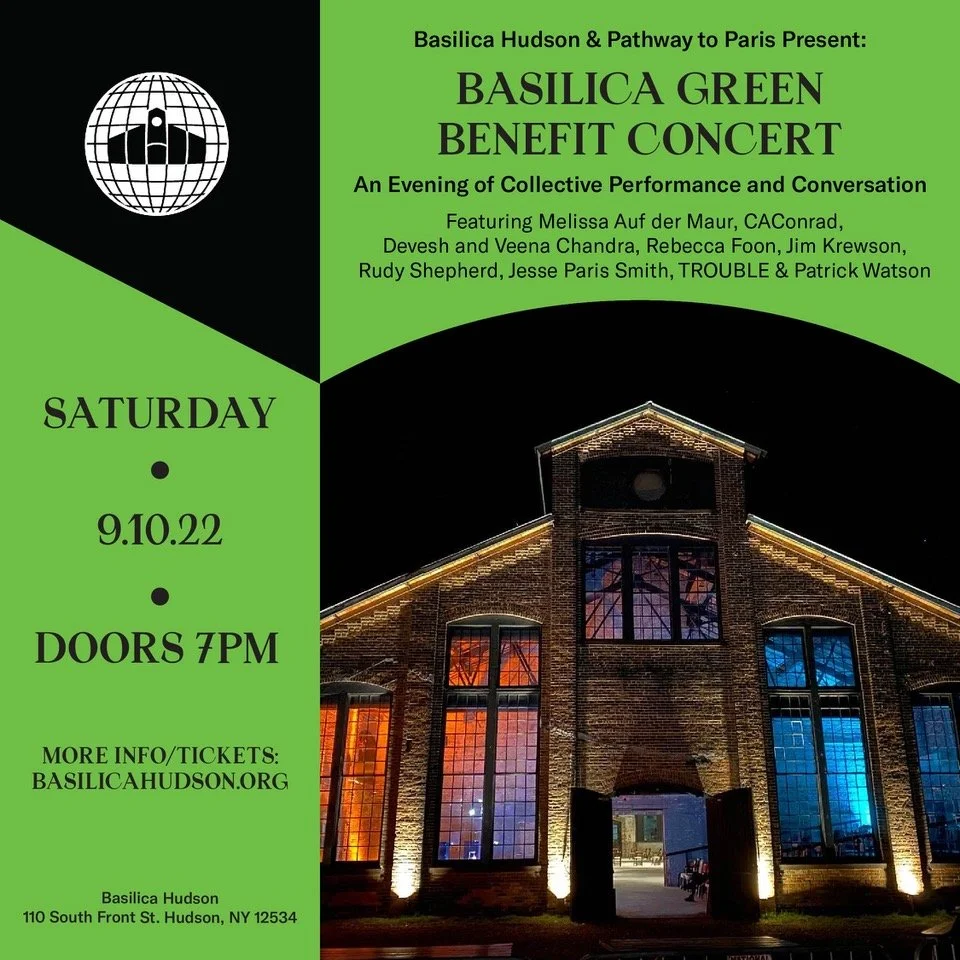Basilica Hudson and Pathway to Paris Co-Present BASILICA GREEN Benefit Concert: An evening of collective performance and conversation featuring Melissa Auf der Maur, CAConrad, Devesh and Veena Chandra, Rebecca Foon, Jim Krewson, Rudy Shepherd, Jesse Paris Smith, TROUBLE, Patrick Watson to benefit BASILICA GREEN’s efforts to increase climate action through innovative programming.