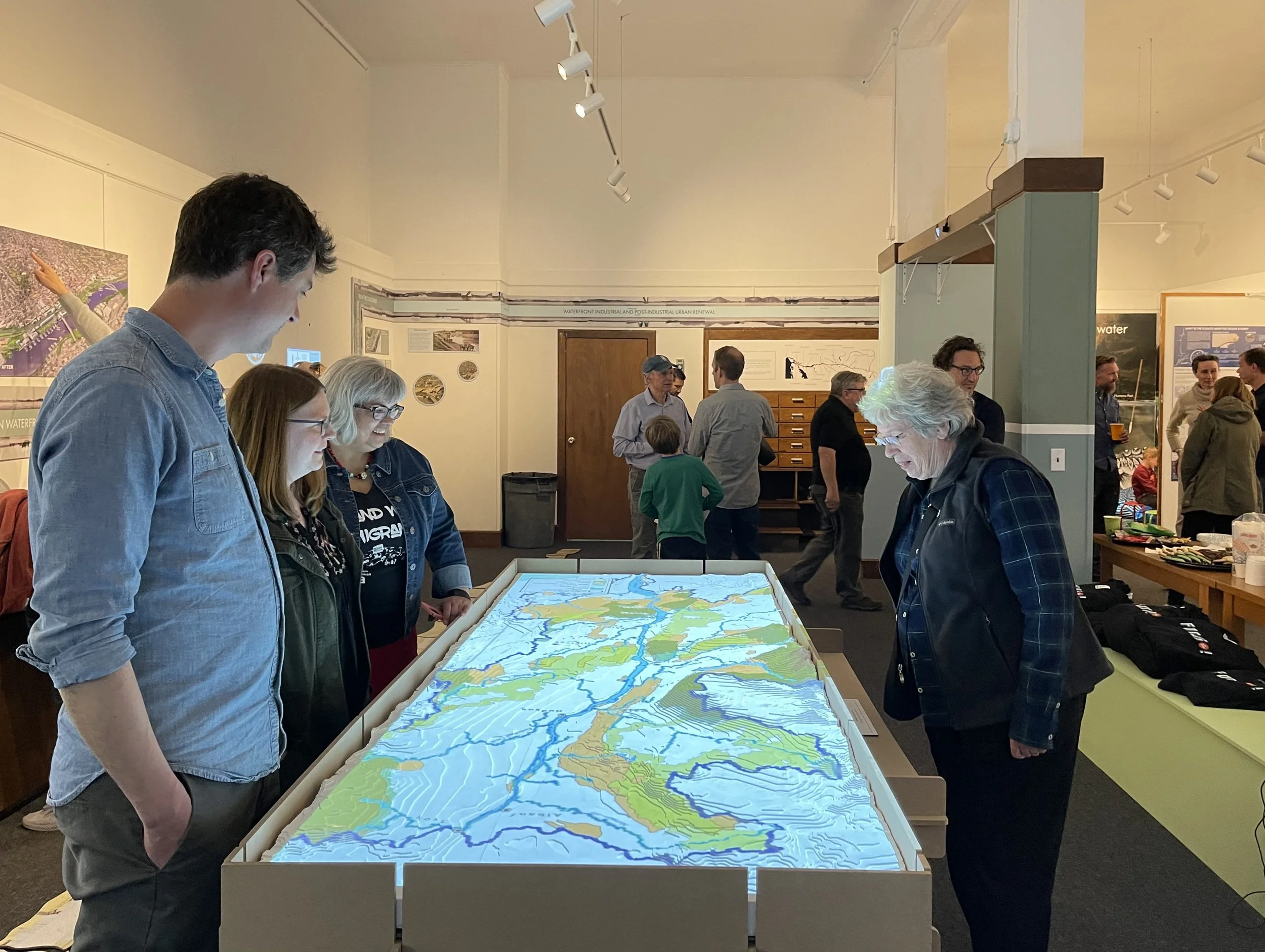 Over 150 people showed up in Downtown Troy to see the new space and view the inaugural exhibit "To Flow Both Ways: The Past, Present, and Future of Hudson Waterfronts." The exhibit explores the ecological features of the tidal estuary, its indigenous history, the industrial era, and future sustainable and resiliency projects along its shorelines. The exhibit was largely designed by RPI students in the School of Architecture, taught by Professor Michael Oatman.